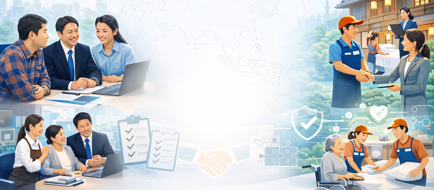 クレアストは、特定技能・技能等の外国人材のご紹介(有料職業紹介)から、在留手続(申請取次行政書士)・登録支援(登録支援機関/入管庁長官登録)まで一貫対応しています。